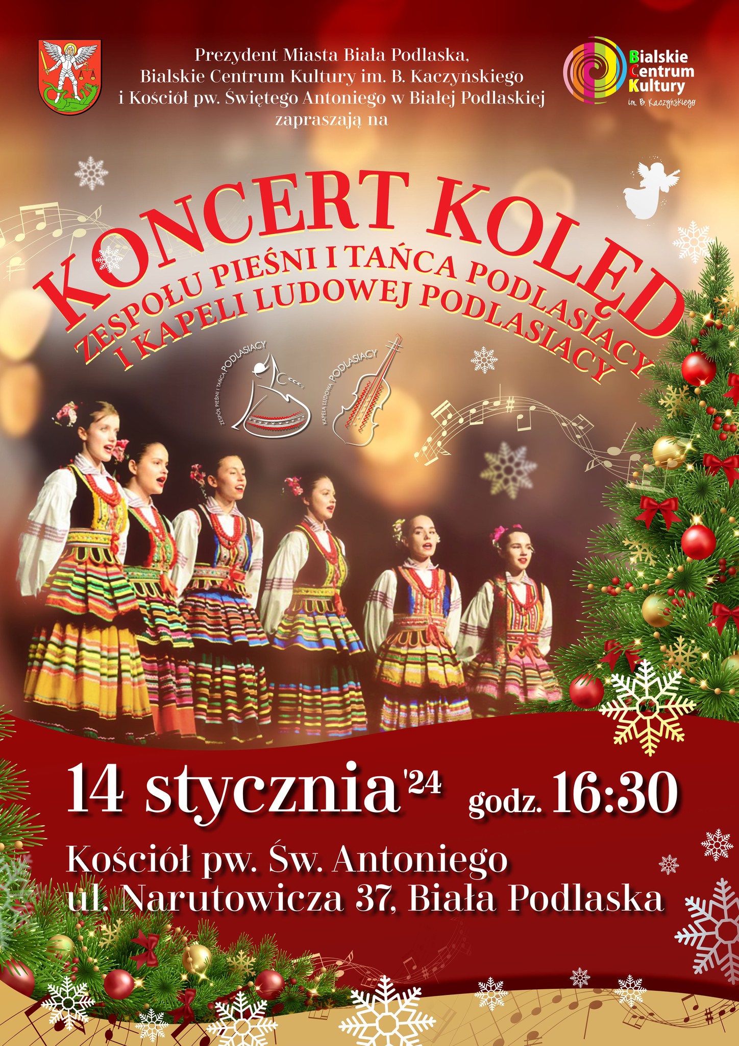 Najpiękniejsze kolędy w wykananiu Zespołu Piesni i Tańca "Podlasiacy" oraz Kapeli Ludowej Podlasiaccy usłyszysz w niedzielę ( tj. 14.01.2024 r.) w Kościele pw. Św. Antoniego w Białej Podlaskiej.