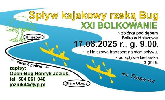 Hniszów Bolkowanie to coroczna impreza dla uczczenia urodzin dębu "Bolko", rosnącego od 600 lat w małej miejscowości pow. chełmskiego – Hniszowie. Wydarzeniem towarzyszącym tegorocznego Bolkowania będzie spływ kajakowy ostatnią dziką rzeką Europy – Bugiem. Planowana trasa Stare Okopy – Hniszów (około 4 h). ...