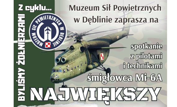 Dęblin Wyjątkowe spotkanie z pilotami i technikami obsługi jedynego w Polsce śmigłowca transportowego Mi-6A "Jagiełło" w Muzeum Sił Powietrznych w Dęblinie. W ramach cyklu "Byliśmy Żołnierzami" uczestnicy poznają fascynujące historie lotów i transportów, które realizowały te imponujące maszyny, a także obejrzą prezentację historyczną opartą na materiałach archiwalnych i ikonograficznych. To okazja, by zobaczyć legendarny śmigłowiec i posłuchać opowieści jego załóg. ...