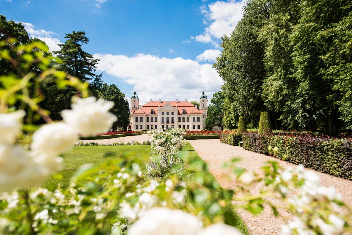 Przypałacowa kaplica wzorowana jest na kaplicy królewskiej w Wersalu. W dawnej powozowni działa Galeria Sztuki Socrealizmu prezentująca obrazy, rzeźby, rysunki, plakaty i inne dzieła, powstałe w latach 50. XX w., kiedy sztukę wprzęgnięto w walkę o socjalizm. W stajni koni cugowych można oglądać wystawę powozów, sprzętu jeździeckiego i akcesoriów podróżnych. Przy pałacu znajduje się reprezentacyjny ogród francuski z fontanną i pomnikiem żołnierzy napoleońskich, oraz romantyczny park w stylu angielskim, z ptaszarnią.
