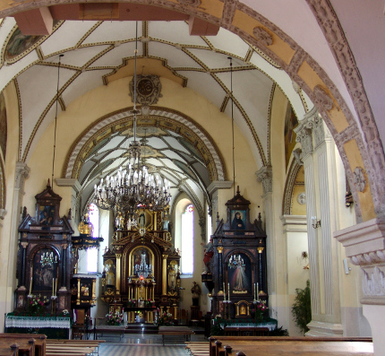 Kościół wzniesiony został w miejscu wcześniejszego, drewnianego kościoła pw. Wszystkich Świętych i NMP z 1447 r., który w 1509 r. spalili Tatarzy. Wystawiony z fundacji rodziny Górków ok. 1530 r., został w tym samym roku konsekrowany przez bpa Jakuba Buczackiego. Z tego okresu zachowało się gotyckie prezbiterium. W l. 1574-1595 kościół działał jako zbór kalwiński. W latach 1620 – 1623 świątynię na polecenie Tomasza Zamoyskiego rozbudowali znani muratorzy Jan Jaroszewicz i Jan Wolff. Kościół urzeka bogactwem renesansowo-manierystycznych dekoracji. Szczególnie cenne są linearno-geometryczne sztukaterie autorstwa Wolffa, zdobiące prezbiterium i dwie boczne kaplice – północną i południową. Sztukaterie w nawie wykonano podczas renowacji kościoła w 1953 roku.