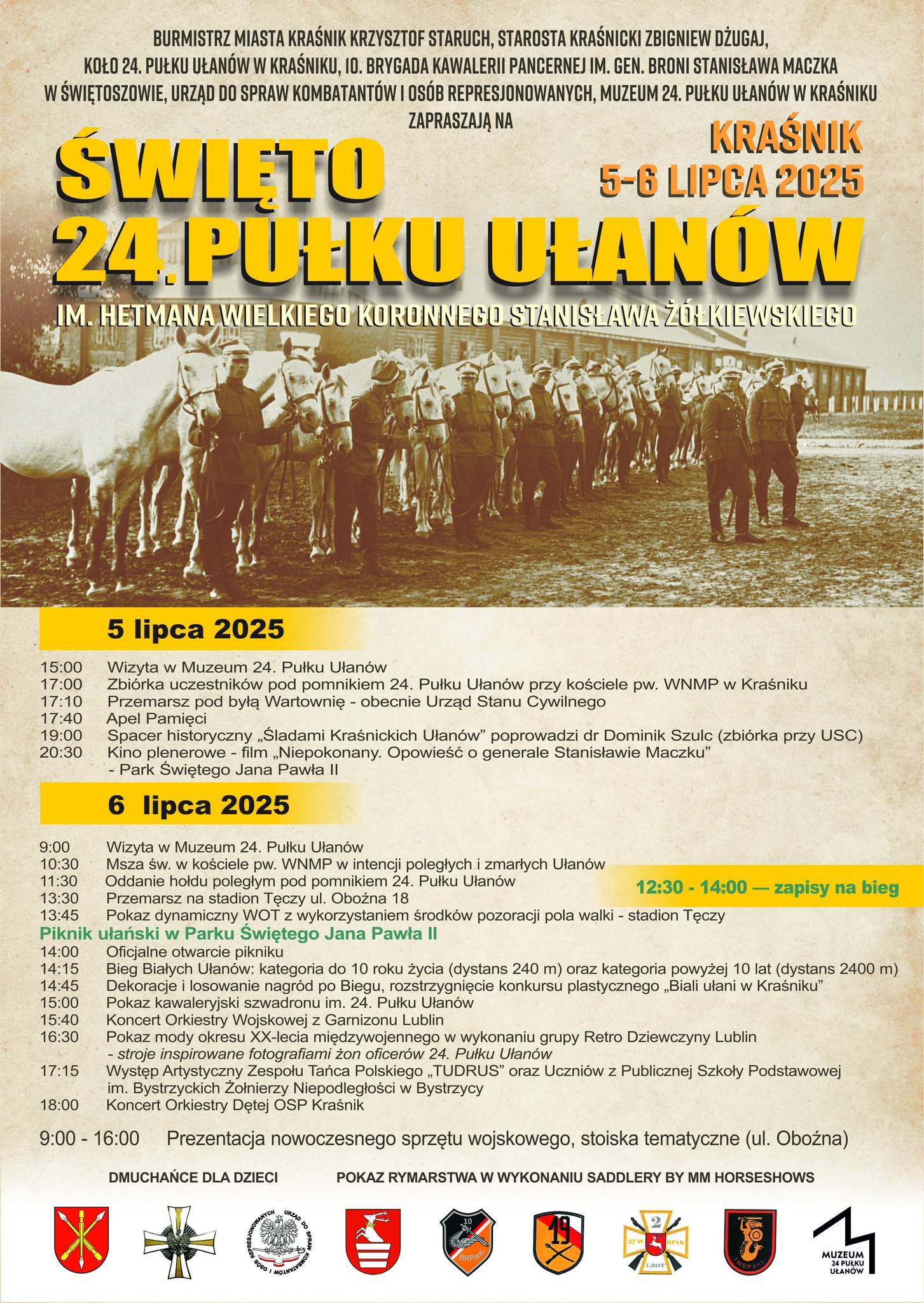 Święto 24. Pułku Ułanów im. Hetmana Wielkiego Koronnego Stanisława Żółkiewskiego odbędzie się w dniach 5–6 lipca 2025 roku w Kraśniku i będzie wyjątkowe z uwagi na 105. rocznicę sformowania pułku. W programie znalazły się m.in. spacery historyczne, kino plenerowe, pokazy kawaleryjskie, bieg „Białych Ułanów”, prezentacje sprzętu wojskowego oraz piknik ułański w Parku Świętego Jana Pawła II. Wydarzenie ma charakter patriotyczno-historyczny i stanowi hołd dla tradycji oraz pamięci żołnierzy 24. Pułku Ułanów.