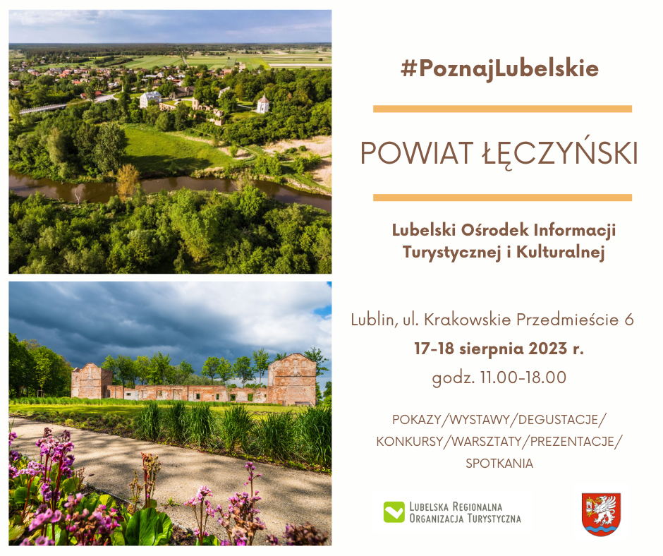 Lubelska Regionalna Organizacja Turystyczna i Starostwo Powiatowe w Łęcznej zapraszają na prezentację oferty Powiatu ŁęczyńskiegoLubelskim Ośrodku Informacji Turystycznej i Kulturalnej, ul. Krakowskie Przedmieście 6, w dniach 17-18 sierpnia 2023 r. w godzinach 11.00-18.00.