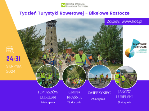 Lubelska Regionalna Organizacja Turystyczna zaprasza na kolejną edycję „Tygodnia Turystyki Rowerowej – Bike’owe Roztocze”, która odbędzie się w dniach 24-31 sierpnia 2024 r. na terenie Roztocza. Głównym organizatorem i koordynatorem „Tygodnia Turystyki Rowerowej „Bike’owe Roztocze” jest Lubelska Regionalna Organizacja Turystyczna. Wydarzenie współorganizowane jest przez Gminę Janów Lubelski, Urząd Miejski w Zwierzyńcu, Gminę Kraśnik oraz Stowarzyszenie Samorządów Euroregion Roztocze. Partnerami wydarzenia są: Urząd Miasta w Tomaszowie Lubelskim, Powiat Kraśn ...