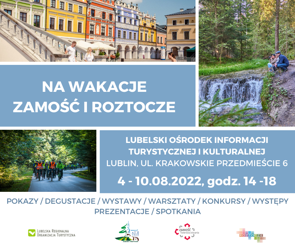 Zapraszamy na prezentację oferty wakacyjnej Zamościa oraz Roztocza w Informacja turystyczna w Lublinie, przy ul. Krakowskie Przedmieście 6, od 4 do 10 sierpnia, w godzinach 14.00-18.00.