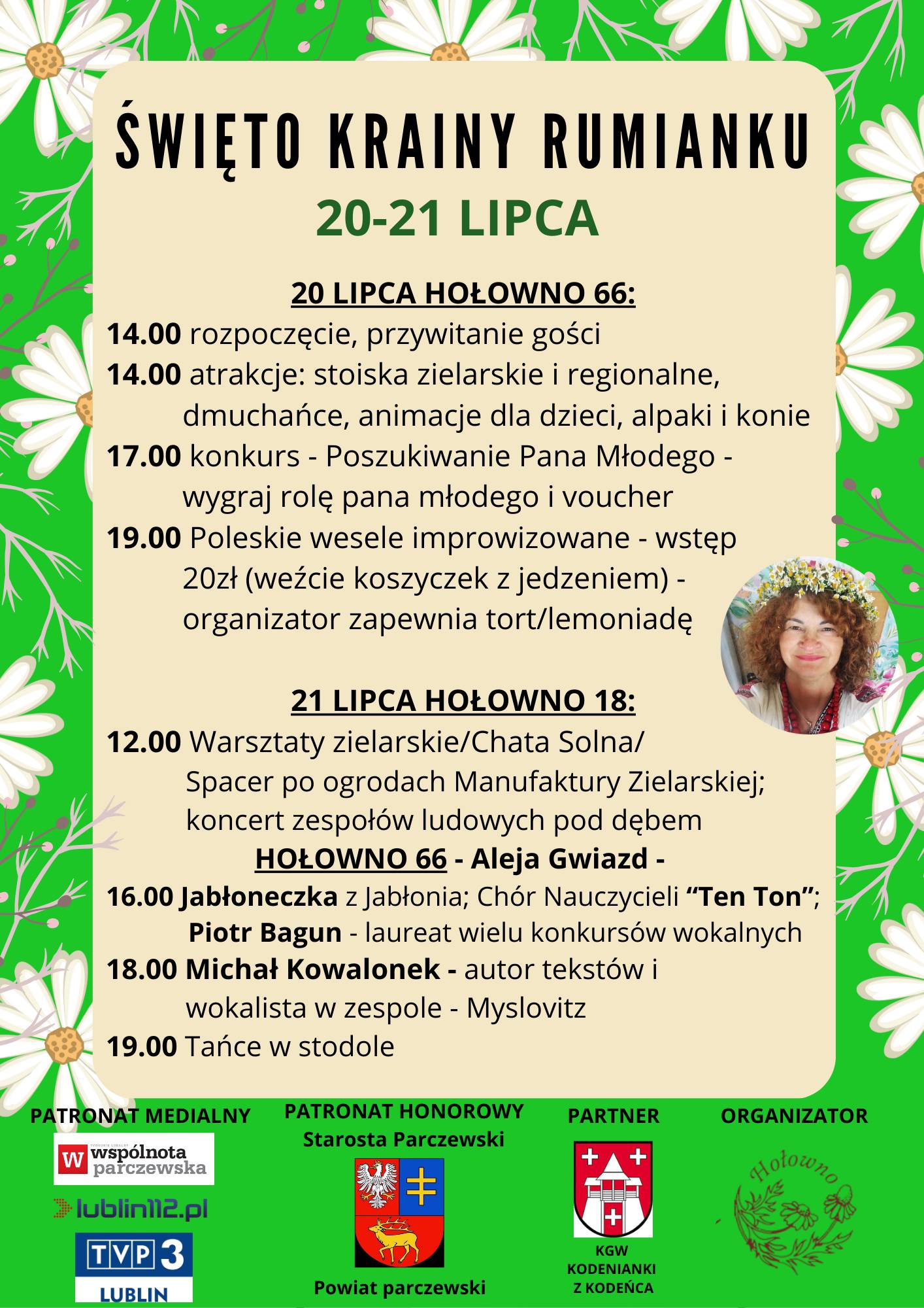 Huczne świętowanie w Krainie Rumianku. Nie zabraknie występów artystycznych, regionalnych cacuszek, zielarskich rozmaitości i przedniej zabawy. W programie między innymi "Poleskie wesele improwizowane".