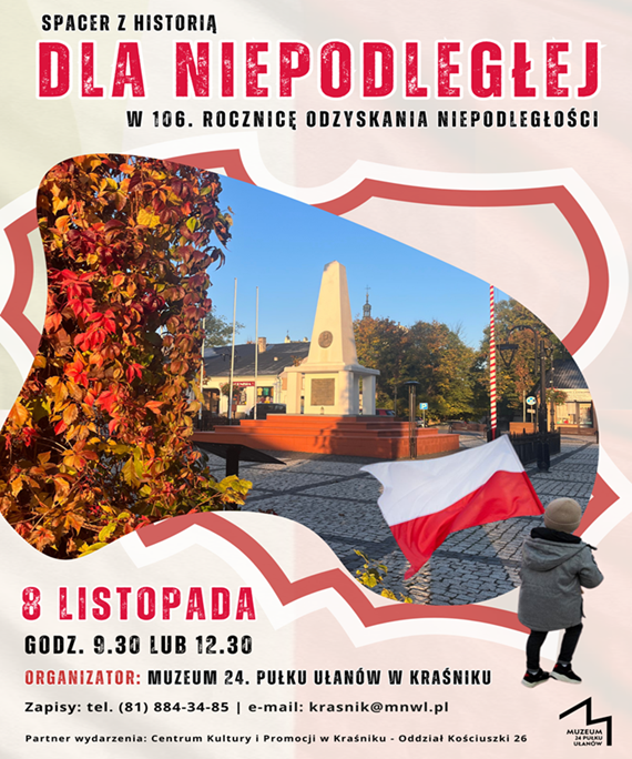 W trakcie spaceru kraśnickimi ulicami zainteresowani poznają miejsca związane z niepodległością w Kraśniku. W programie spaceru jest wizyta w Izbie Pamięci. Uwaga, wymaga jest wcześniejsza rezerwacja