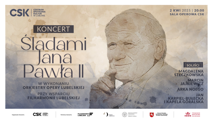 Koncert „Śladami Jana Pawła II” w lubelskim Centrum Spotkania Kultur to muzyczne wydarzenie upamiętniające papieża Polaka i jego przesłanie o wspólnocie i pojednaniu. Wystąpią Orkiestra Opery Lubelskiej, Filharmonia Lubelska oraz goście specjalni, w tym Magda Steczkowska, Marcin Jajkiewicz i Arka Noego. W programie znajdą się utwory inspirowane nauczaniem Jana Pawła II oraz fragmenty jego przemówień. Koncert zakończy wykonanie „Barki” – ulubionej pieśni papieża.