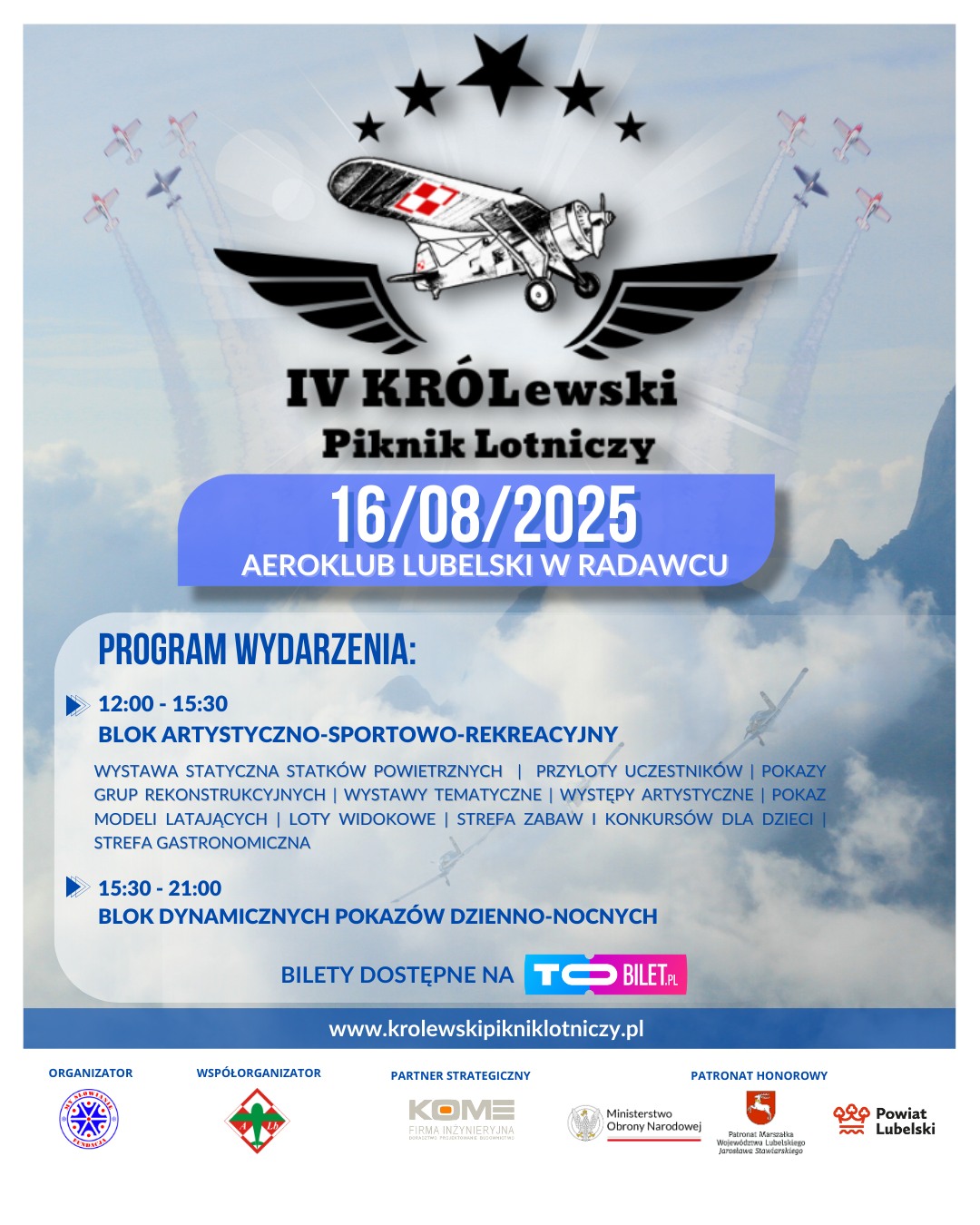 IV KRÓLewski Piknik Lotniczy już 16 sierpnia w nowej lokalizacji – na terenie Aeroklubu Lubelskiego w Radawcu! Przed uczestnikami dzień pełen emocji: artystyczne i sportowe atrakcje, rodzinne animacje oraz spektakularne pokazy lotnicze, także po zmroku. Na niebie zaprezentują się najlepsi piloci z Polski i zagranicy, oferując niezapomniane widowisko. To wydarzenie, które łączy pasję do lotnictwa z rozrywką dla całych rodzin.