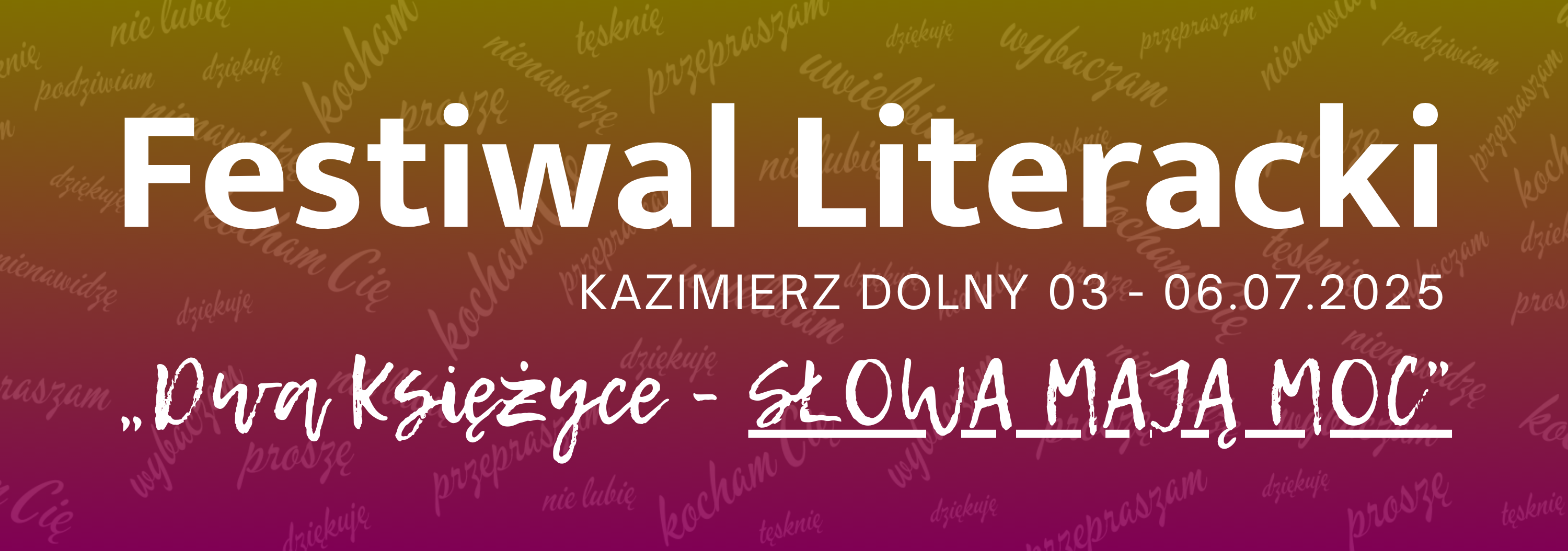 Festiwal Literacki Dwa Księżyce - Słowa mają moc | Kazimierz Dolny 03-07-25 06-07-25 Kazimierz Dolny Spotkanie z literaturą w nadwiślańskim miasteczku. Więcej informacji na facebook.com/FestiwalDwaKsiezyce