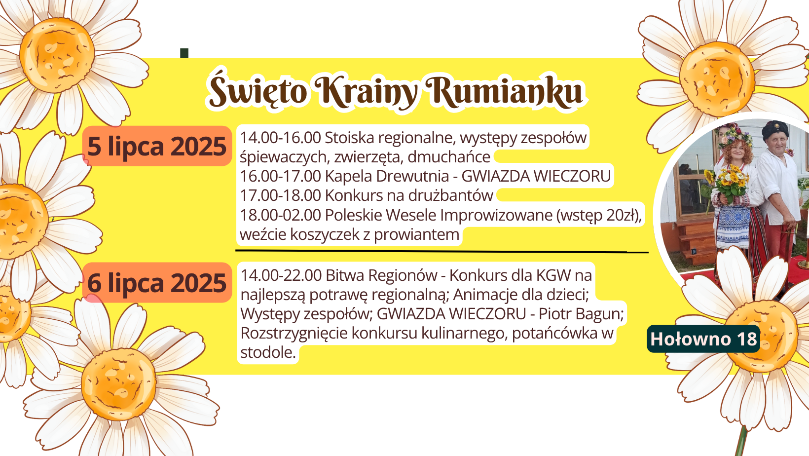 Huczne świętowanie w Krainie Rumianku. Nie zabraknie występów artystycznych, regionalnych cacuszek, zielarskich rozmaitości i przedniej zabawy. W programie między innymi "Poleskie wesele improwizowane".