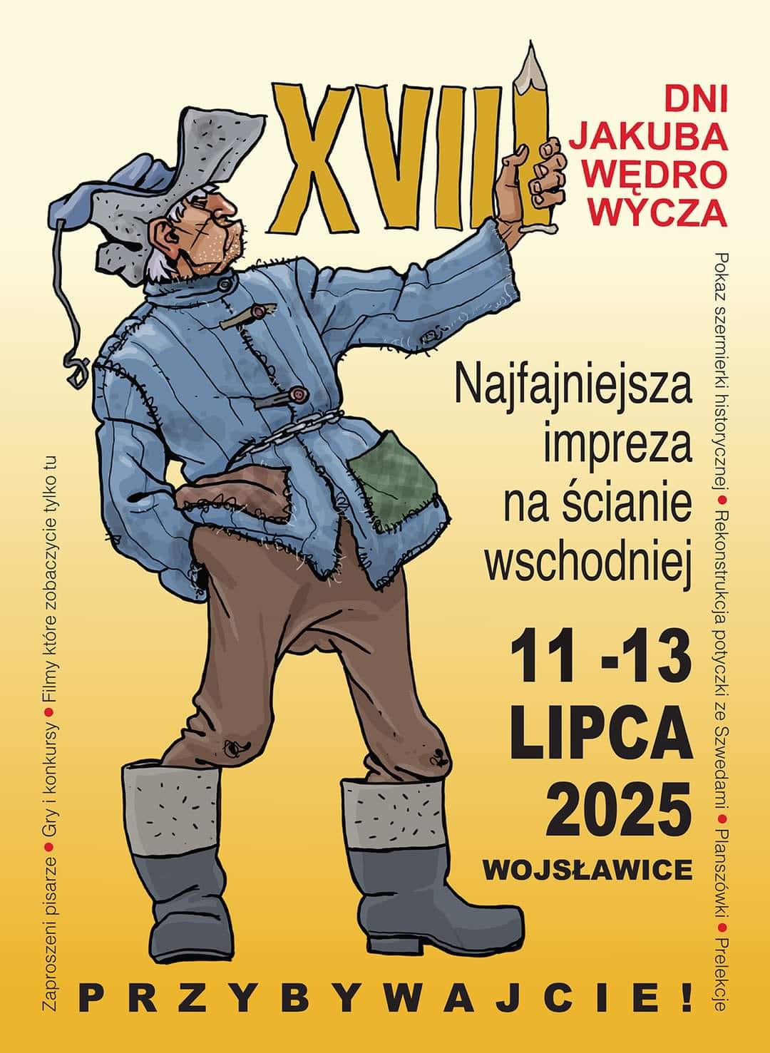 Dni Jakuba Wędrowycza, które odbędą się w dniach 11–13 lipca 2025 roku w Wojsławicach, to już osiemnasta edycja wydarzenia poświęconego kultowej postaci z serii książek Andrzeja Pilipiuka. Festiwal łączy literaturę, rekonstrukcje historyczne, warsztaty i zabawy tematyczne. W programie znajdą się m.in. spotkania z autorami, pokazy kowalstwa artystycznego oraz targi rękodzieła. Wydarzenie zostało uhonorowane trzecim miejscem w konkursie na Najlepszy Produkt Turystyczny Województwa Lubelskiego 2024, co potwierdza jego rosnącą rangę w regionie.
