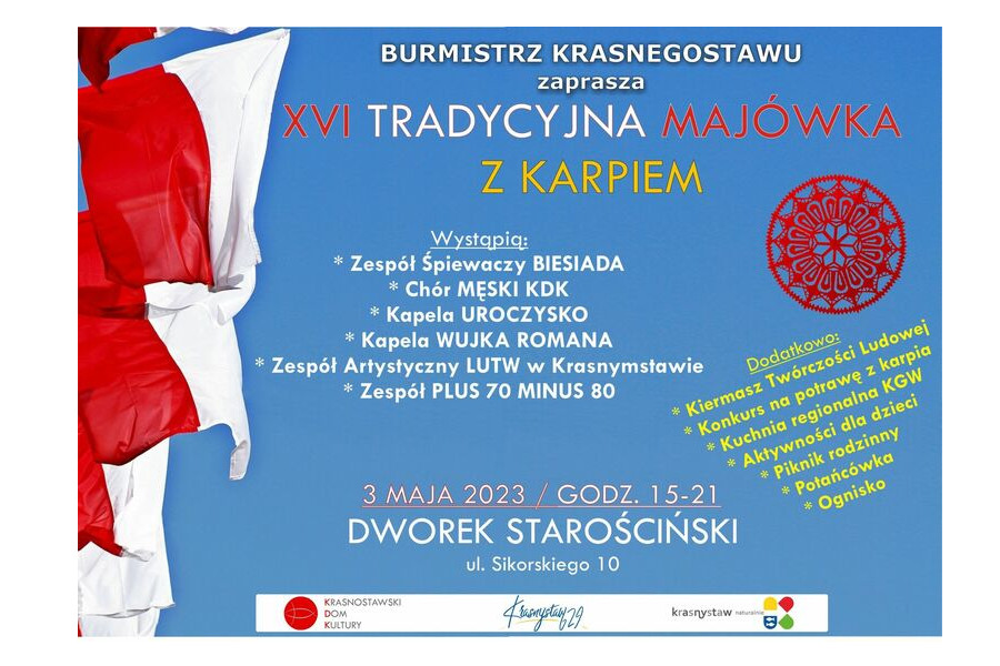 Krasnystaw Przed nami szesnasta edycja krasnostawskiej Majówki z Karpiem. W programie między innymi konkurs na najlepszą potrawę z karpia, występy kapel podwórkowych i zabawy dla najmłodszych. Nie zabraknie także regionalnych specjałów czy rękodzieła. ...