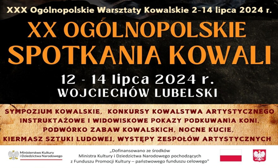 Dziś kowalstwo to nie tylko rzemiosło, to sztuka. Kunszt kowali – artystów będzie można podziwiać w czasie lipcowych Ogólnopolskich Spotkań Kowali w Wojciechowie. W programie wydarzenia konkursy kucia artystycznego, pokazy podkuwania koni, kiermasz sztuki ludowej a także występy artystyczne. Więcej informacji na kowale.com.pl ...