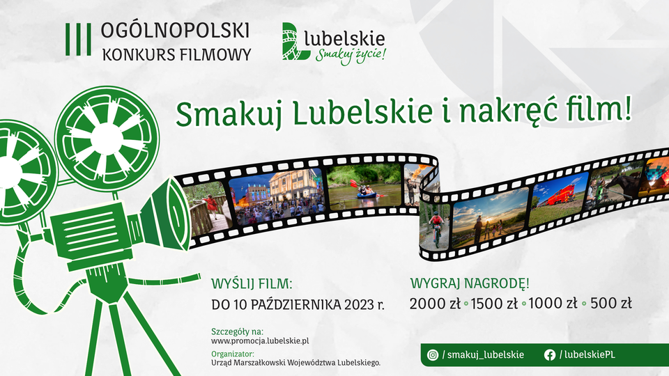 Urząd Marszałkowski Województwa Lubelskiego zaprasza do udziału w III edycji Ogólnopolskiego Konkursu Filmowego „Lubelskie. Smakuj życie!” na najlepszy film promujący region lubelski. Konkurs będzie się odbywał w 2 kategoriach: film trwający do 15 sekund oraz film trwający od 15 sekund do 3 minut. W konkursie mogą wziąć udział zarówno profesjonaliści, jak i amatorzy. Na zwycięzców czekają wartościowe nagrody. Filmy można zgłaszać do 10 października 2023 r. Szczegółowe informacje, karty zgłoszeniowe oraz regulamin dostępne są na stronie organizatora. Więcej ...