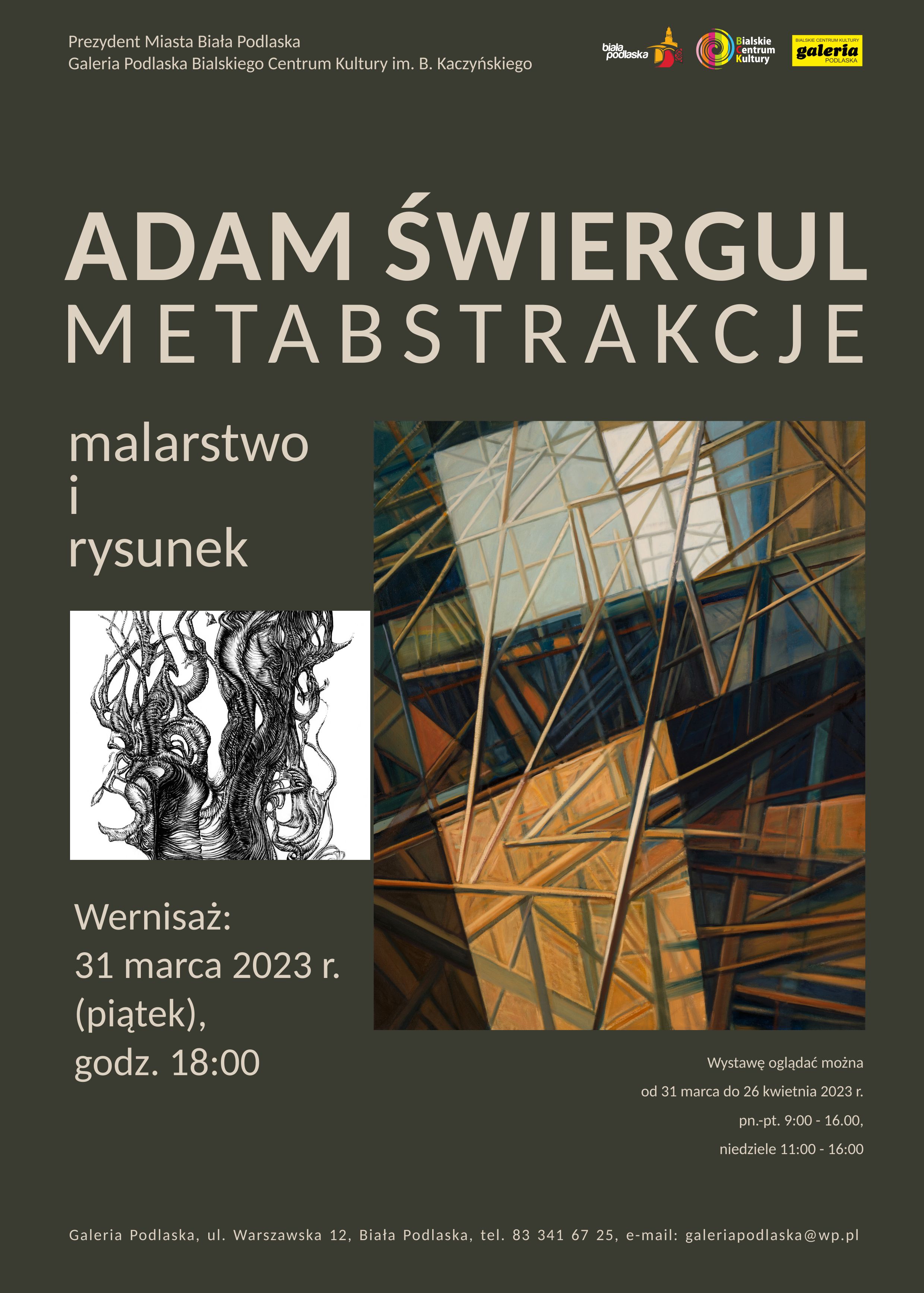 Mamy interesującą propozycję dla miłośników malarstwa abstrakcyjnego. W piątek 31 marca w Galerii Podlaskiej odbędzie się wernisaż wystawy obrazów Adama Świergula. Wystawa dostępna do 26 kwietnia 2023 roku.