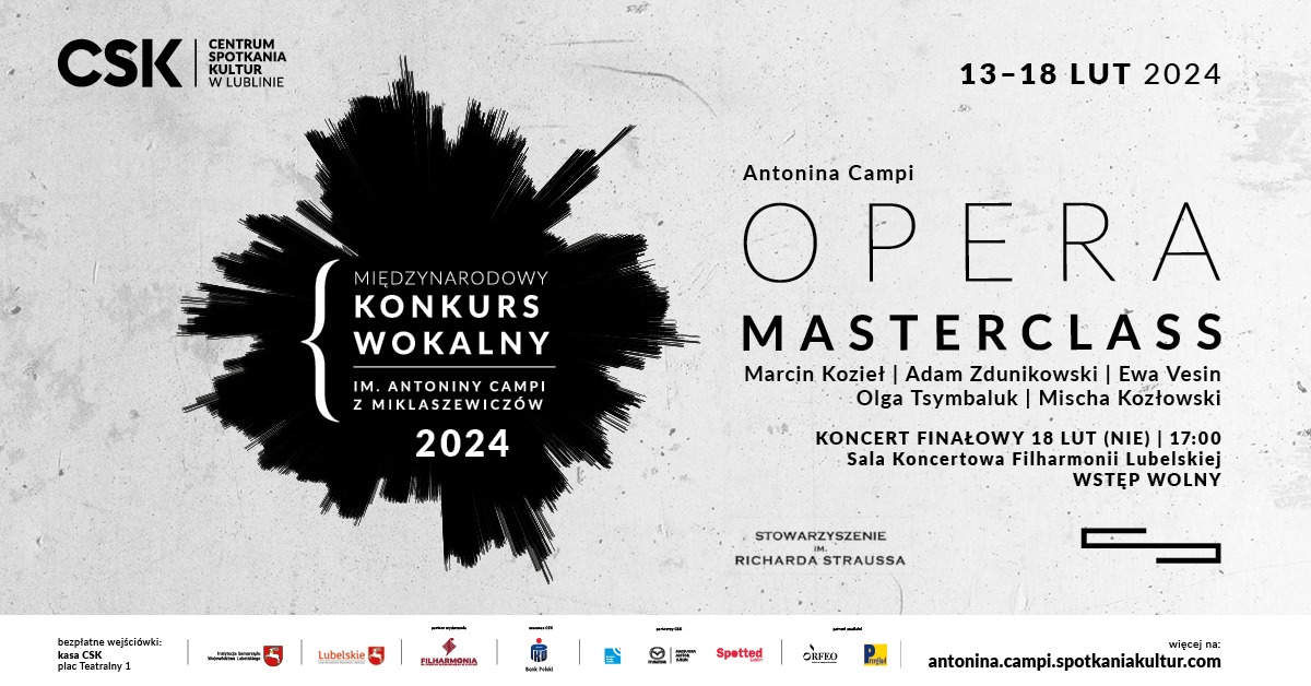 Arie i pieśni operowe w wykonaniu uczestników kilkudniowych warsztatów prowadzonych przez światowej sławy mistrzów operowych. Koncert galowy odbędzie się 18 lutego 2024.
